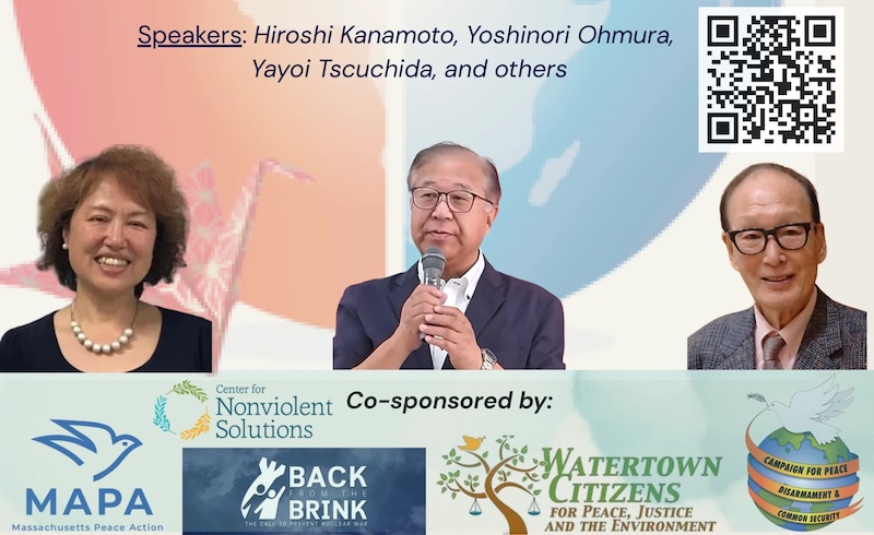 Come learn from those who have experienced the nuclear attack on Hiroshima and Nagasaki in 1945 and its consequences and those who are leading the nuclear disarmament efforts in Japan. Our guests are Hirosi Kanamoto the Assistant Secretary General of Nihon Hidankyo, the 2024 Nobel Peace Prize recipient organization, Yoshinori Ohmura a second generation Hibakusha and a leading figure in Nihon Hidankyo, and Yayoi Tsuchida the Assistant Secretary General of Gensuikyo, the Japan Council against A- & H-Bombs. Organized by Dr. Joseph Gerson, a long-time resident of Watertown and the Executive Director of the Campaign for Peace, Disarmament and Common Security, the delegation will join nuclear disarmament activists at events in Cambridge on May 3, in Bridgewater on May 4, and in Worcester on May 5. Special note about the Cambridge event: People will be welcome at 1991 Massachusetts Avenue beginning at 2 p.m. You can register for any of the three events at https://cpdcs.org/events/join-japanese-a-bomb-survivors-massachusetts-disarmament-activists/