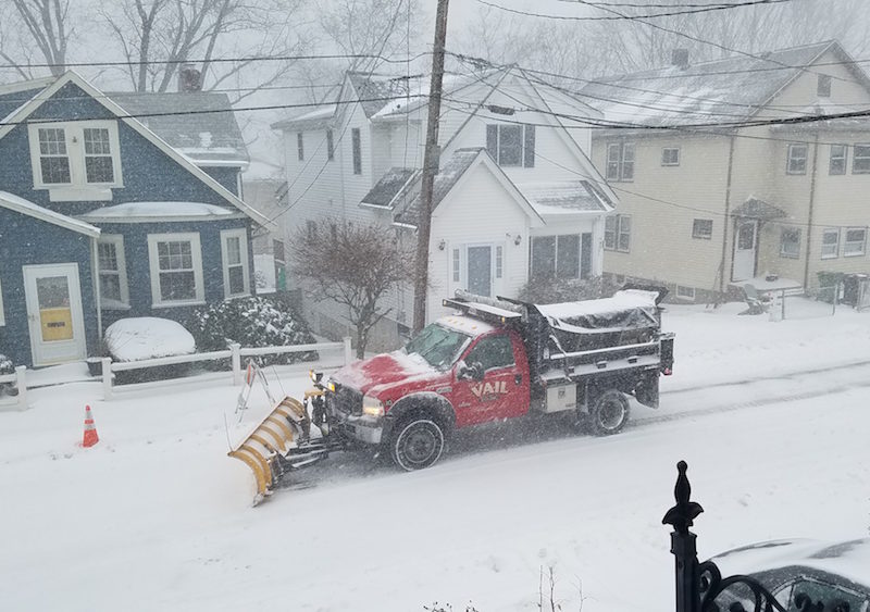 Charlie BreitroseA truck plows a Watertown street. Watertown Public Works crews will be busy this week continuing efforts to dig the City out after the heavy snow on Sunday and Monday, said City Manager George Proakis. “This storm was significant – over 19 inches of snow in Watertown since Sunday. The DPW crews have been working for over 50 hours, but they are not done yet,” Proakis said. “They are going to be addressing a number of challenging spots over the next few days, including many of those snowbanks at the street corners.”