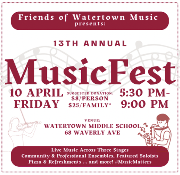 Friends of Watertown Music invites you to our 13th Annual MusicFest this Friday, April 10th. Doors open at 5:15 p.m. and performances start promptly at 5:30 p.m.! Come celebrate music with us! This year we again feature a variety of music – folk, jazz, classical, pop, and rock – in concurrent solo and group acts on different “stages” including, among others: Flip Zero; Don Bakerian & Friends; Dead Stock; The Moxley Boys; many popular Watertown Public School teachers in various groups; student jazz bands; Girls Like That; piano, woodwinds, reeds, brass, strings, voice, ukelele … in solos or small ensembles. And no MusicFest would be complete without representation from local favorites Ruth Rappaport & Peter Wetherbee – this year we welcome JOE PETE is 3 in 1!