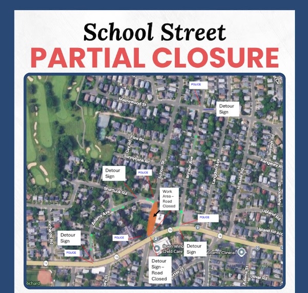 Starting 4/21/2026 through 4/24/2026, a detour will be in place on School Street for milling and paving operations.