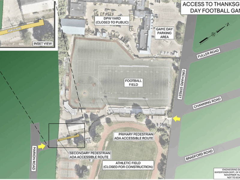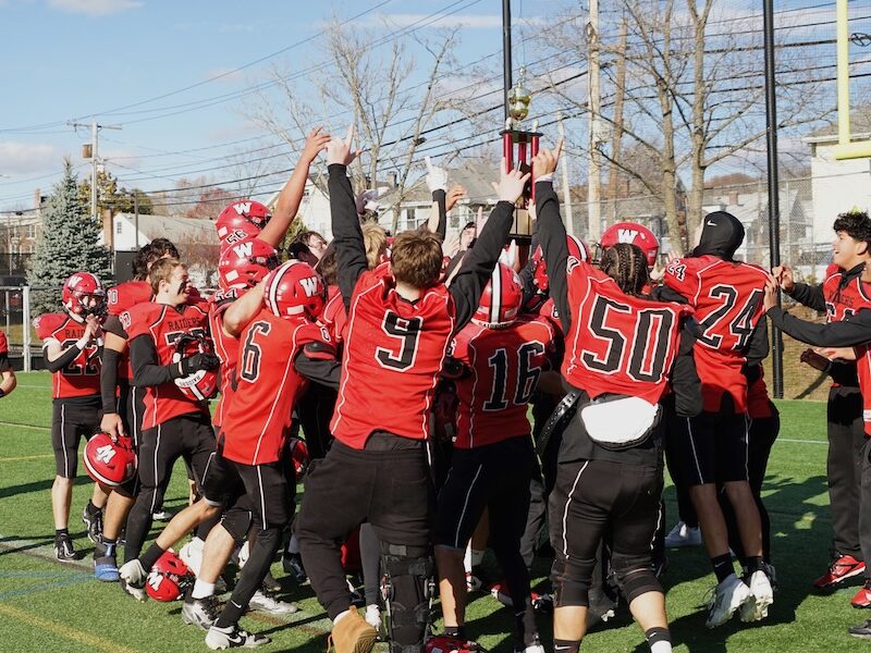 On a beautifully sunny Thanksgiving morning, with a gusty wind making it feel a little cooler then it really was, the 3-7 Watertown Raiders welcomed the 0-9 Belmont Marauders to Victory Field for the 103rd meeting of these two schools that dates back to 1921. In a game that was close throughout, Watertown won its second straight Thanksgiving Day game, this time by the score of 21-12. There’s so much great that comes from sport. The practice and the training and the education and the challenge and the joy, and even the heartbreak. Football provides all of that and more, and it’s why the sport is so popular. It’s also so because there’s a comradery that is formed from battling it out on the football field, and winless or undefeated or somewhere in-between, there’s so much to value in the experience of being part of a football team. It was clear from the start that Belmont, despite a difficult season that had them scoring only 36 points in nine games and being shut out five times, was together as a team and ready to give it its all to win the rivalry game. The sideline was into it, the players on the field were into it, and it was a sign of good coaching that Belmont was showing no quit on this day.