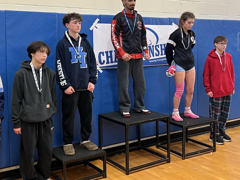 Watertown senior Fahad Kahn, on the top step, won the 106 pound class MIAA Div. 3 North Sectional Meet for the second year in a row. (Watertown Athletics)