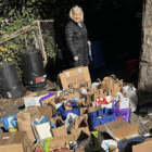 Watertown Food Pantry Coordinator Kathy Cunningham looks as some of the food donations from the November Porch Pick Up. (Contributed Photo)